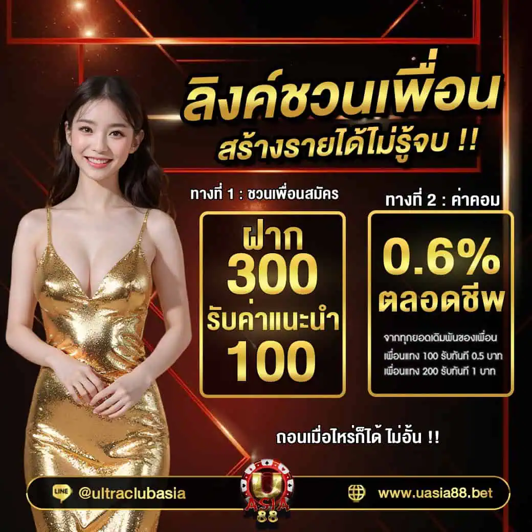 ท่านสามารถนำลิงค์ด้านล่างนี้ไปแชร์ในช่องทางต่างๆไม่ว่าจะเป็น เว็บไชต์ส่วนตัว, Blog, Facebook, IG, Line หรือ Social Network อื่นๆ หากมีการสมัครสมาชิกโดยคลิกผ่านลิ้งค์แนะนำเพื่อนของเว็บ ULTRACLUB ASIA ของท่านเข้ามา ลูกค้าที่สมัครเข้ามาก็จะอยู่ภายใต้เครือข่ายของท่านทันที และหากลูกค้าภายใต้เครือข่ายของท่านมีการเดิมพันเข้ามา Uasia88 ทุกยอดการเดิมพัน ท่านจะได้รับส่วนแบ่งในการแนะนำเพื่อน 0.5% ในลำดับที่ 1 และ 0.1% ในลำดับที่ 2 ทันทีโดยไม่มีเงื่อนไขและไม่จำกัดจำนวน ตัดยอดทุกวัน ถอนเงินเมื่อไหร่ก็ได้ ล็อคอินเช็คยอดได้ตลอดเวลา
